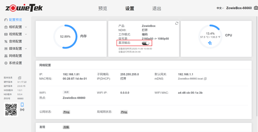 ZowieBox的直流输出功能默认关闭,若需使用ZowieBox的直流输出功能,请先登录ZowieBox的网页控制界面。