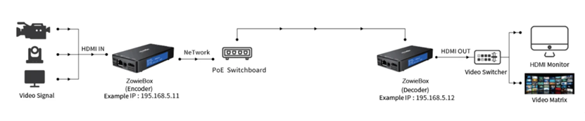 进行点对点图传请准备两台ZowieBox。一台作为编码器(例:192.168.5.11)将HDMI的输入信号源转换为NDI,一台作为解码器(例:192.168.5.12)对NDI源进行解码并输出到显示器上。