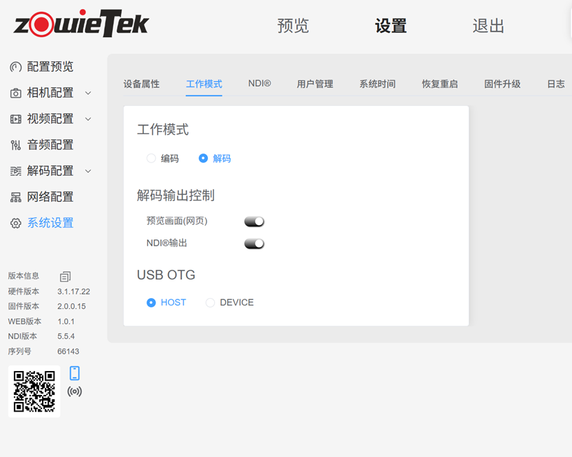 - 4、 进入解码器(例:192.168.5.12)的网页控制界面,依次点击设置->系统设置->工作模式,将工作模式切换成解码模式。