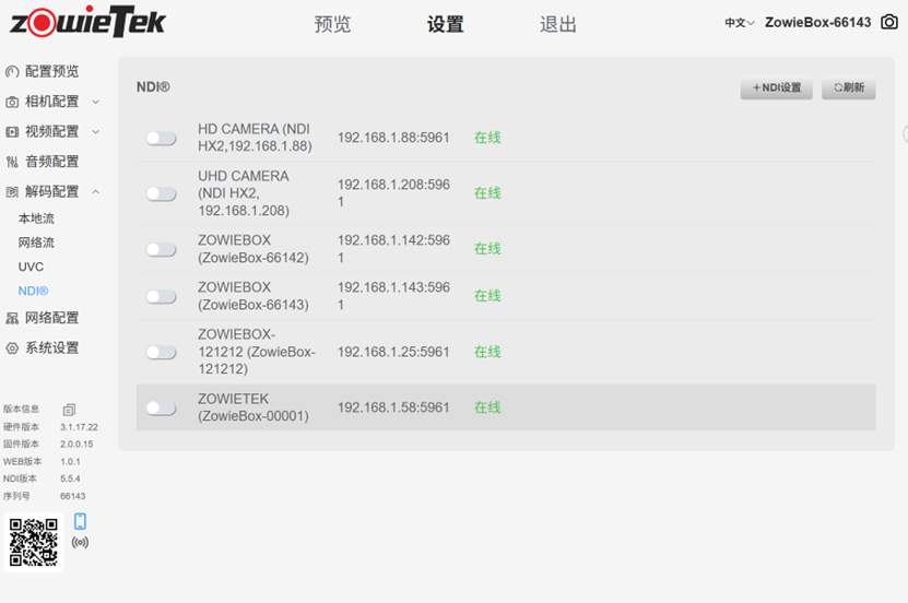 5、 在解码器(例192.168.5.22)的网页控制界面中,依次点击设置->媒体配置->解码,打开所需要的NDI流进行解码。将HDMI的输出接入到显示屏中便可查看解码视频。