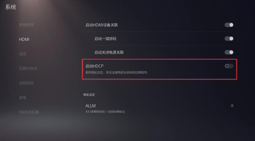 1、请将PS5的HDMI输出信号直接接入到显示屏,进入PS5的系统设置界面,在HDMI设置中将HDCP关闭。