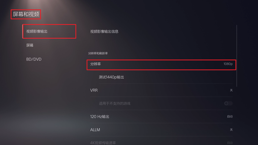 2、进入PS5的系统设置界面,点击屏幕与视频,在视频影像输出中将分辨率切换为1080p。