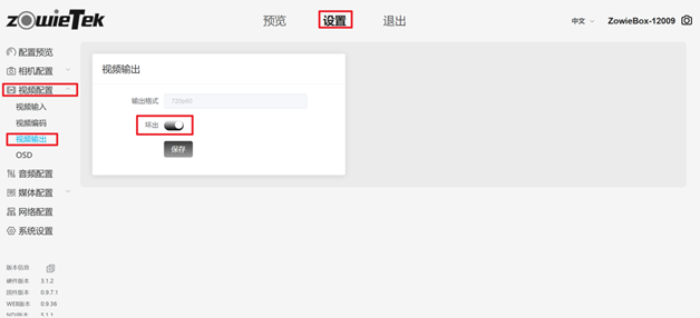 4、登录ZowieBox的网页控制界面,依次点击设置->视频设置->视频输出,将输出切换为环出以体验零延时的输出。