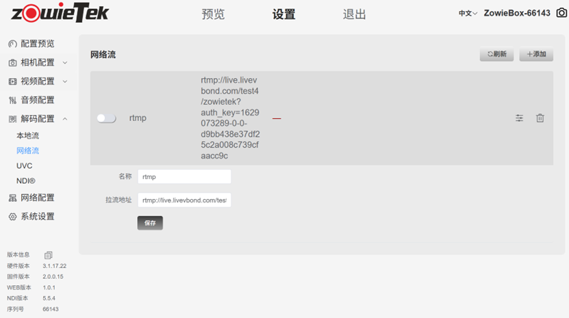 进入编码器的网页控制界面后,依次点击设置->媒体配置->网络流,点击+添加,输入网络流的名称与推流URL,点击保存后打开推流按钮。