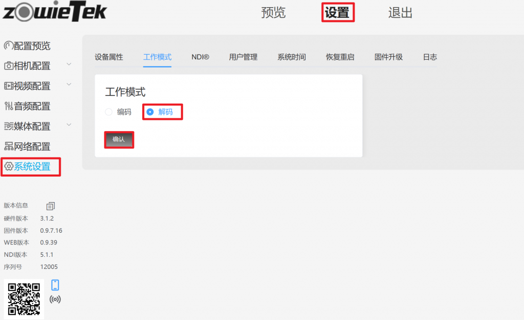 进入解码器的网页控制界面,依次点击设置–>系统设置->工作模式,将工作模式切换成解码模式。