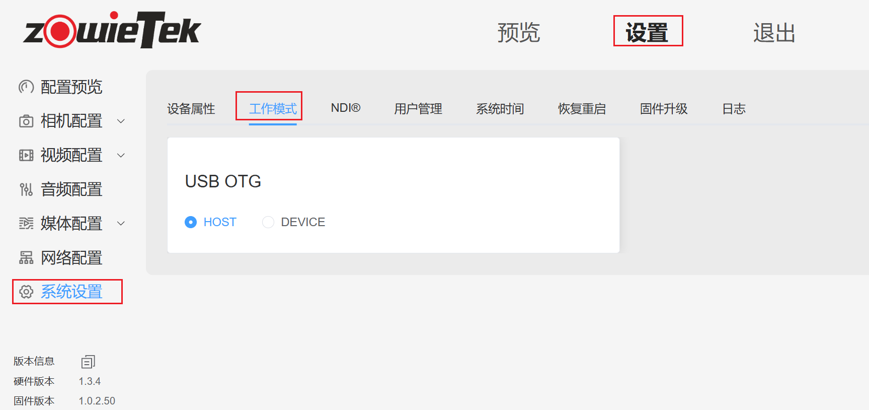 对于支持UVC out功能的设备,请登录后台控制界面,依次点击设置->系统设置->工作模式,进行USB模式的切换。