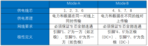 IEEE 802.3af/at标准中定义了两种POE的供电方式,Mode A与Mode B主要区别在于使用以太网电缆中的哪些线芯来传输电力。