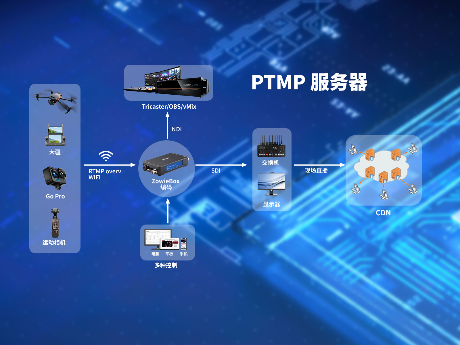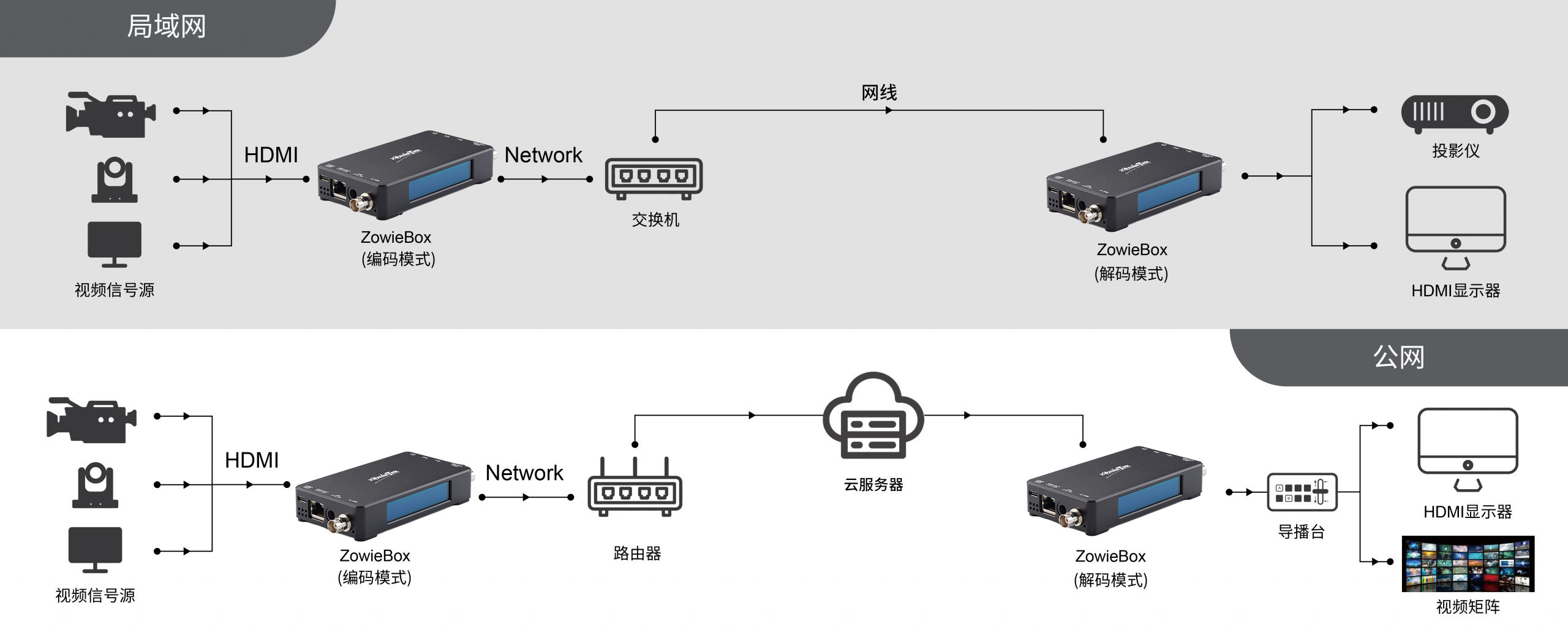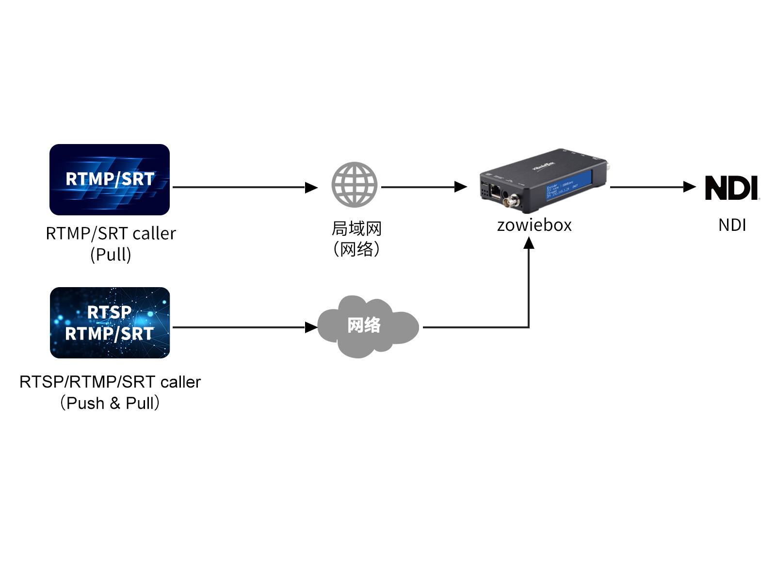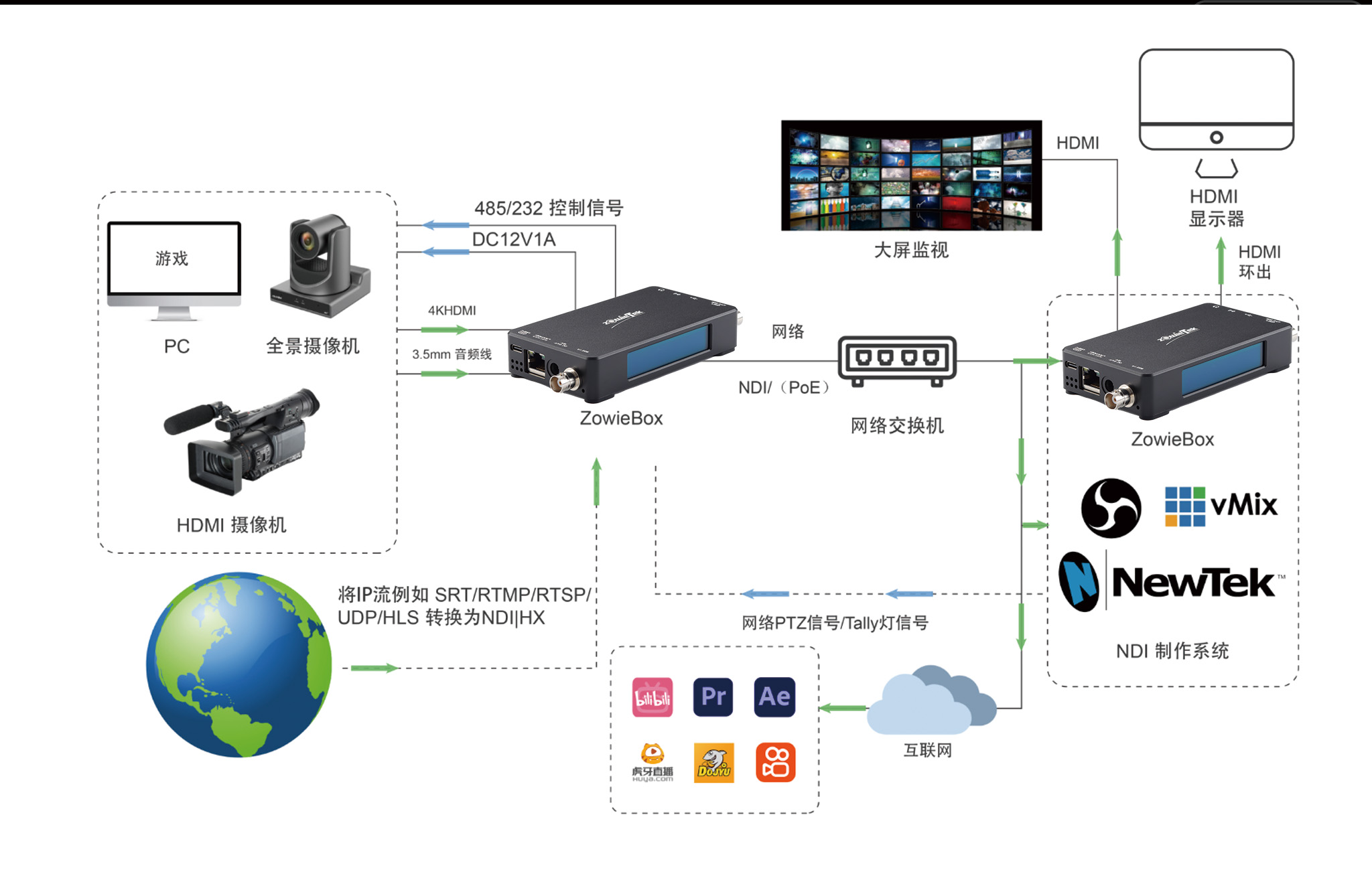 通过 ZowieBox,来自计算机、摄像机等的任何视频信号可以远程传输至远端,在局域网中的传输延迟仅为 100 毫秒;通过 SRT 或 RTMP 等协议,网络可以支持远距离点对点的传输。