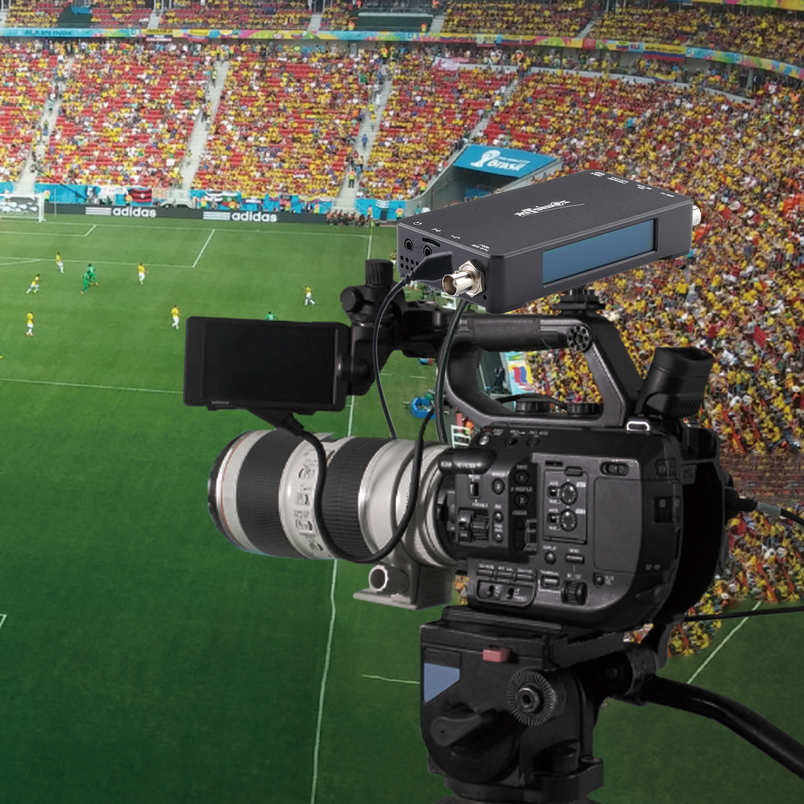 ZowieBox 可以使用标准的 1/4 英寸三脚架安装座轻松安装到任何单反相机上。它能够高效地将专业摄像机和显示屏的现有视频信号转换为兼容 NDI 技术的实时、高质量、低延迟的 IP 视频流。