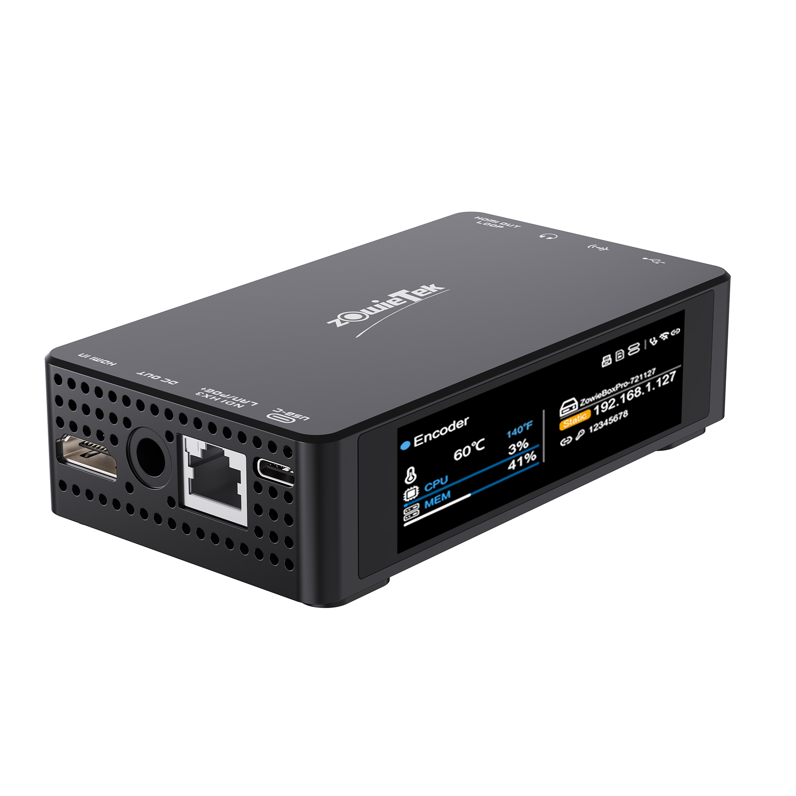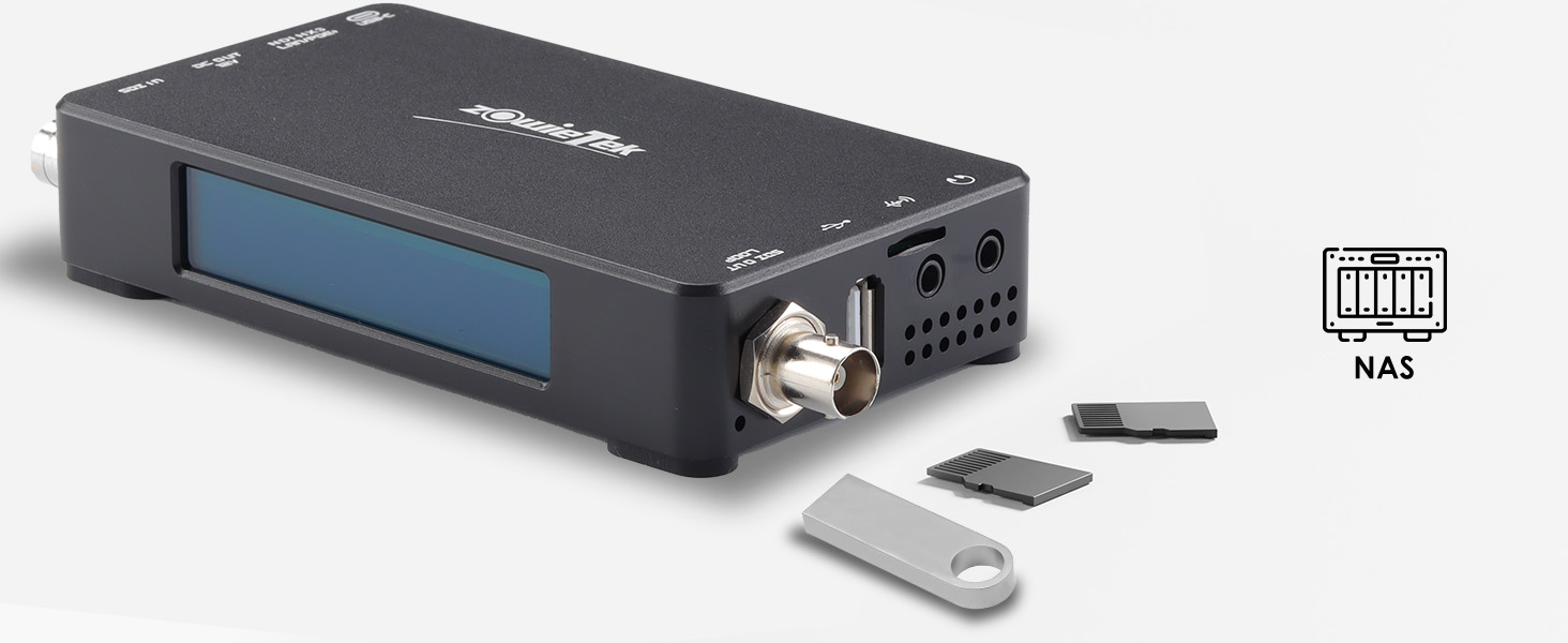 ZowieBox 支持同时进行流媒体和录制,视频帧率可达 60fps,并支持 24 帧电影帧率。输入内容可以录制为文件,存储到 TF 卡、USB 存储或 NAS。前置迷你屏幕可以实时显示当前设置和工作状态。如果您有无限存储空间,还可以选择下一代 HEVC 格式进行归档和编辑。