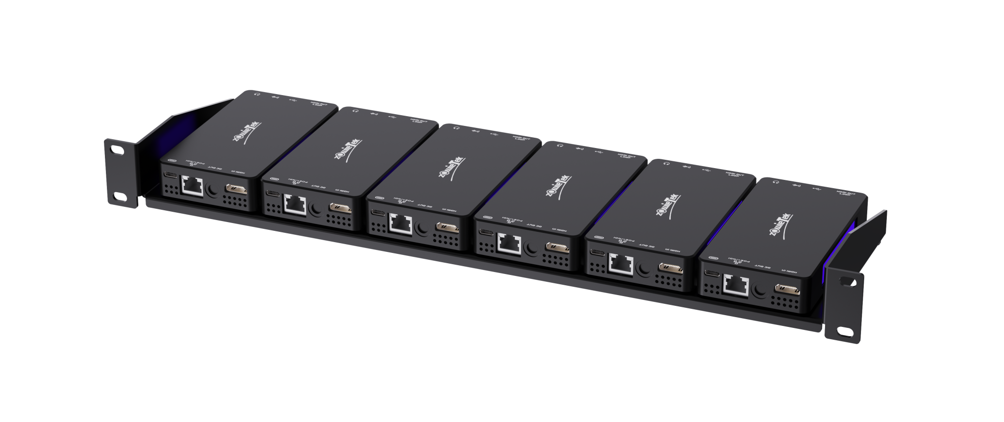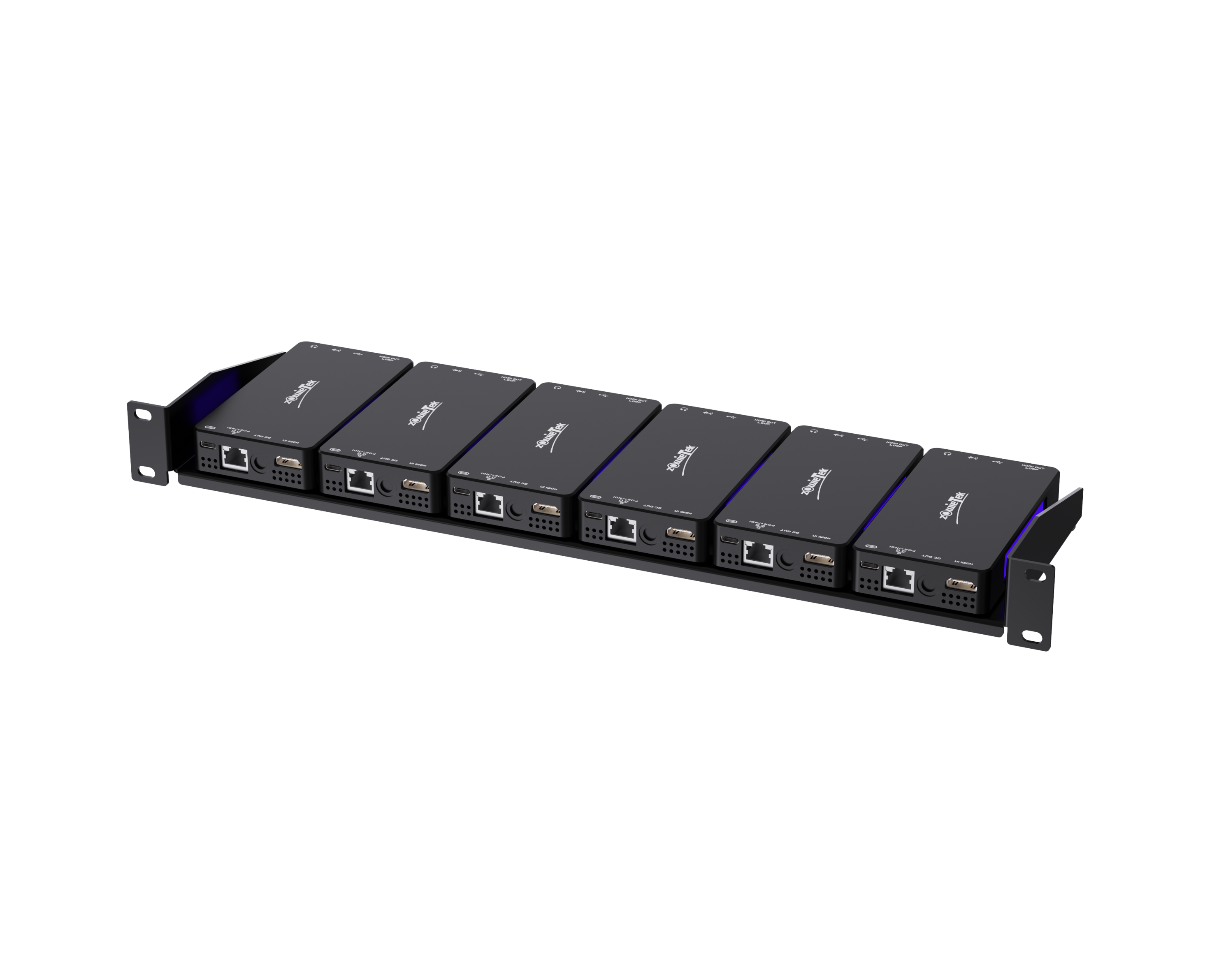 ZowieX 1U 机架式安装架专为专业工作流程而设计,旨在将多个 ZowieBox 设备整齐、安全、高效地集成到标准的 19 英寸机架系统中。